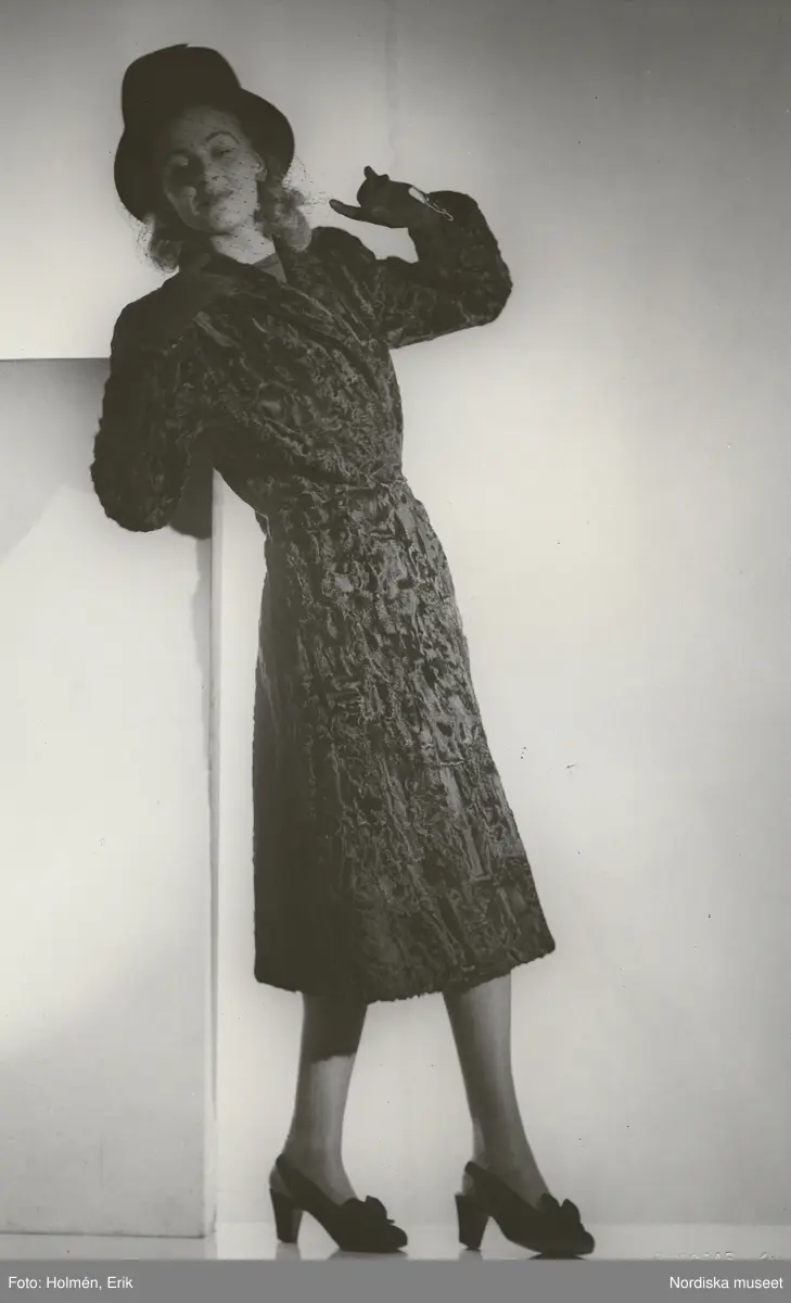 Nordiska Kompaniet. Kvinna i mörk päls och svart hatt med flor. Text på baksidan: "Arkivbild d. 21/8 45"