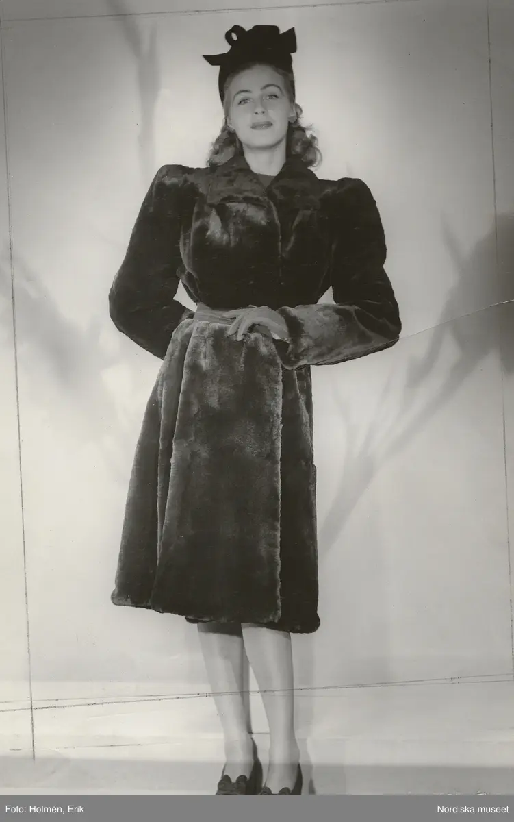 Nordiska Kompaniet. Kvinna i mörk päls med hårt knutet skärp. Mörk hatt med rosett, ljusare handskar.