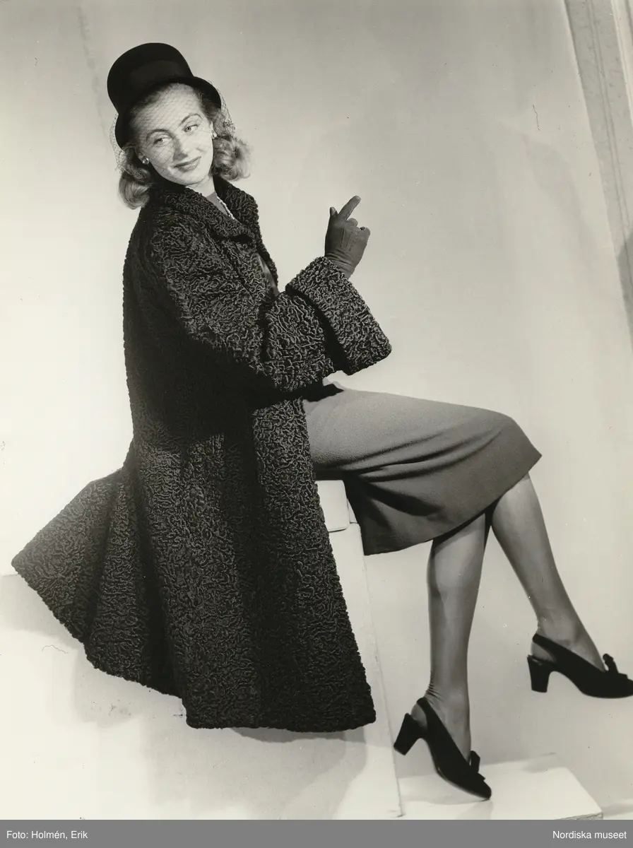 Nordiska Kompaniet. Kvinna i persianpäls, mörk hatt med flor samt mörka handskar.