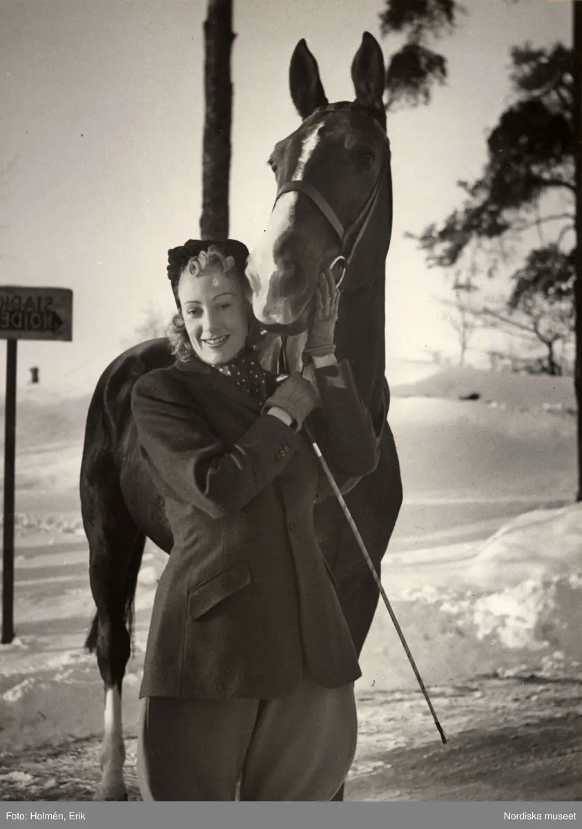 Fru Karin Ekelund från Herrskrädderiet på Nordiska Kompaniet iklädd ridjacka och ridbyxor i snöigt landskap tillsammans med häst.