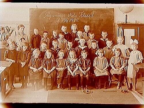 Rynninge skola, klassrumsinteriör, 27 skolbarn med lärare, klass 1.