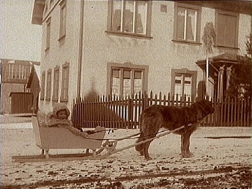 Hunden Björn med släde och en liten flicka i släden, utanför ett hus.