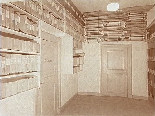 Örebro Läns Museum, interiör mot söder från arkivrummet mellan expeditionen och intendentens rum, före omordnandet 1948.