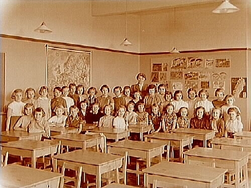 Titel: Engelbrektsskolan, klassrumsinteriör, 36 flickor med lärarinna fru Greta Sondell, klass 4J, sal 22.