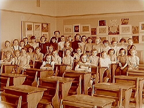 Titel: Engelbrektsskolan, klassrumsinteriör, 33 flickor med lärarinna fru Hertha Nessen, klass 4i, sal 12.