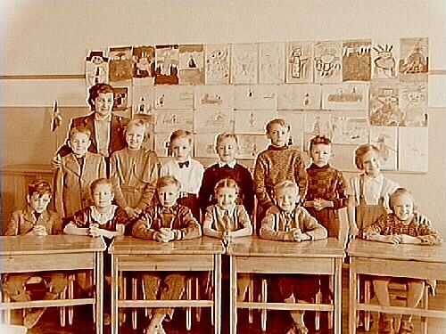 Titel: Olaus Petriskolan, klassrumsinteriör, 13 skolbarn med lärarinna fru Dagmar Ohlsson, klass 2e, sal 24.