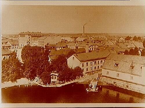 Vy över Örebro mot nordöst. Bostadshus, Snusfabriken, Åkerhielmska huset och Husarkasernen.