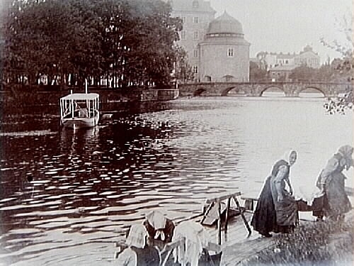 Fyra kvinnor vid klappbryggan vid Svartån, liten ångslup i ån, Slottet i bakgrunden.