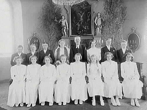 Konfirmander, 10 flickor, 5 pojkar och kyrkoherde Erhard Morén.