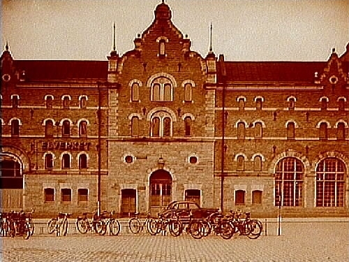 Titel: Gas och Elverket, stenhus i fyra våningar med fasad i rött tegel och sandsten.