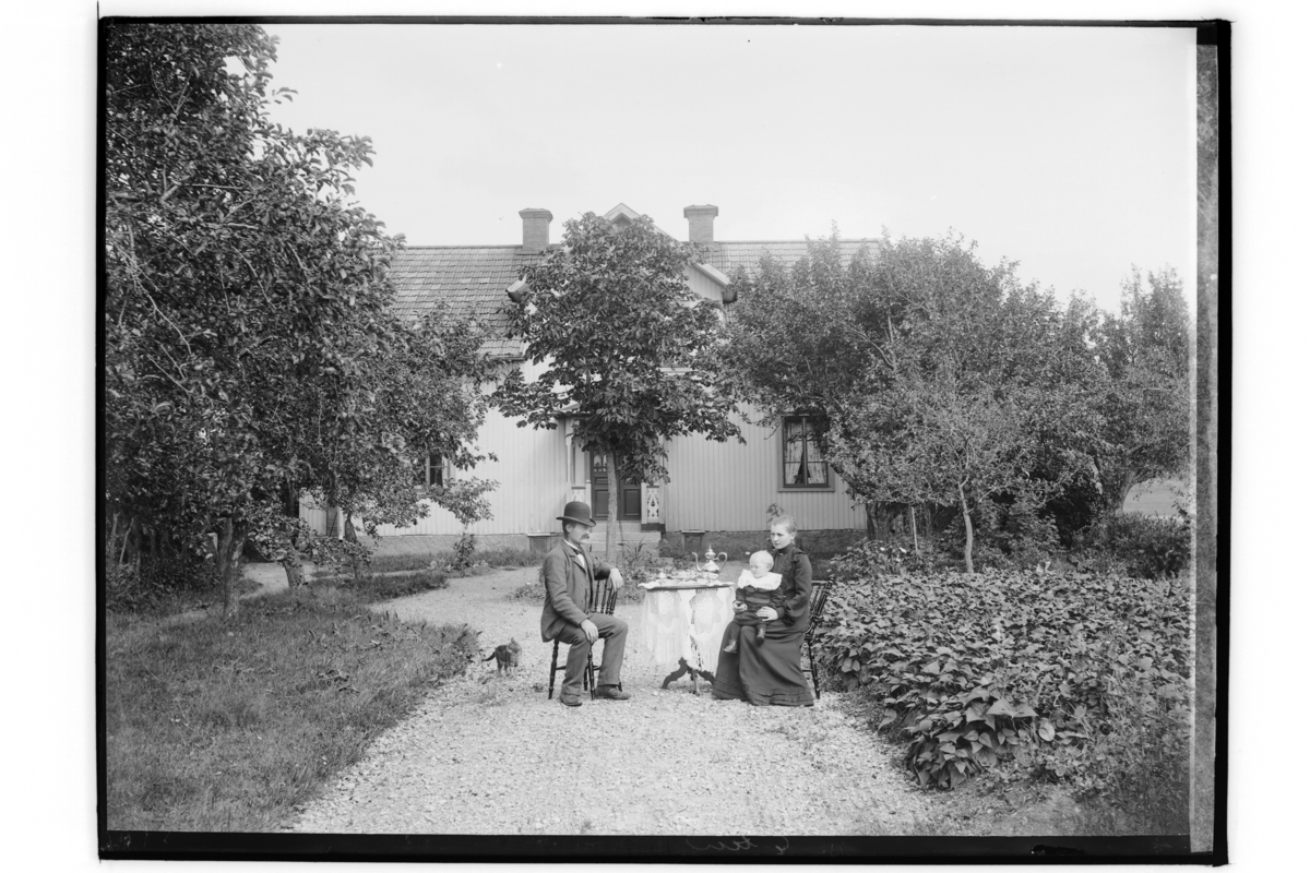 Bostadshus, 3 personer vid kaffebordet, en katt.