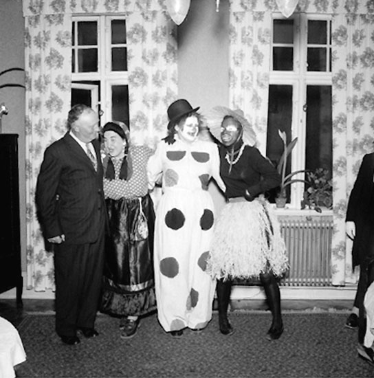 Rumsinteriör, grupp 4 utklädda personer, möhippa.