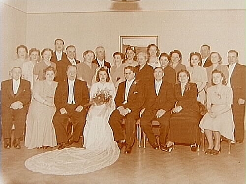 Titel: Bröllop, brudpar och bröllopsgäster, interiör.