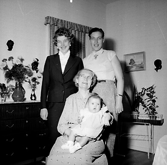 Rumsinteriör, släktgrupp fyra personer, fyra generationer.