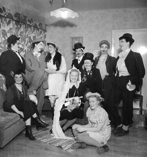 Titel: Rumsinteriör, grupp tio personer, möhippa. Ulfgren