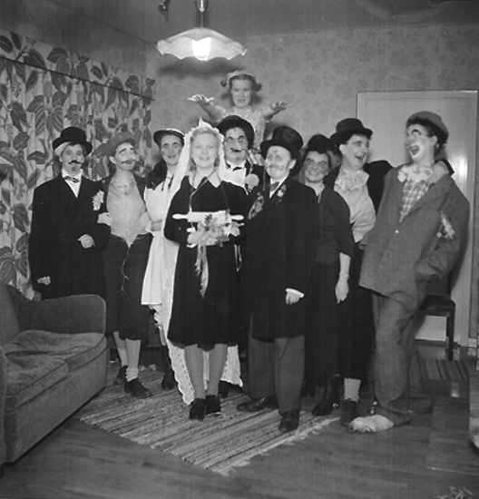 Titel: Rumsinteriör, grupp tio personer, möhippa. Ulfgren