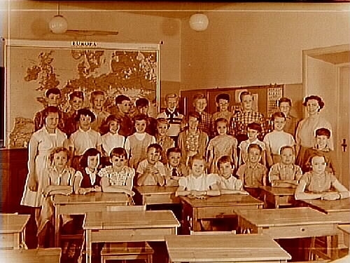 Almby Östra skola, klassrumsinteriör, 30 skolbarn med lärarinna fröken Birgit Dahlström, klass 4Oo, sal 9.