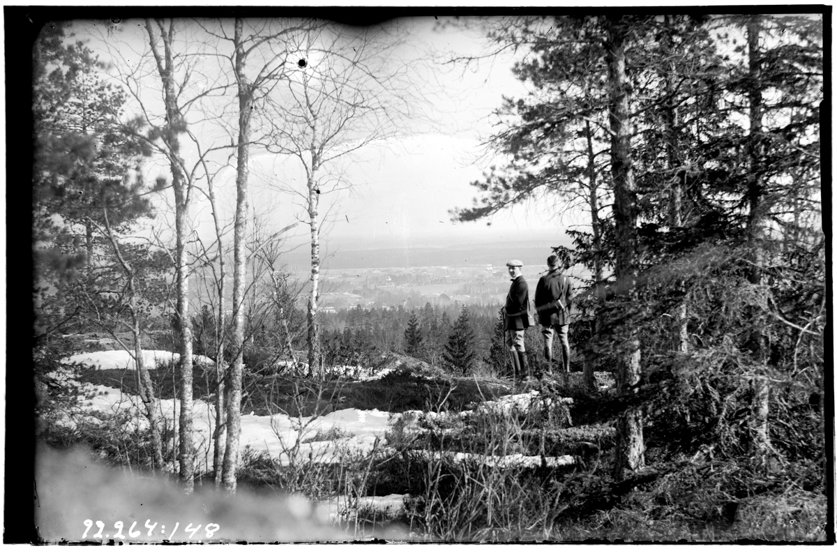 Hålahult sanatorium, exteriör, klintaberget? två män tittar på utsikten från ett berg