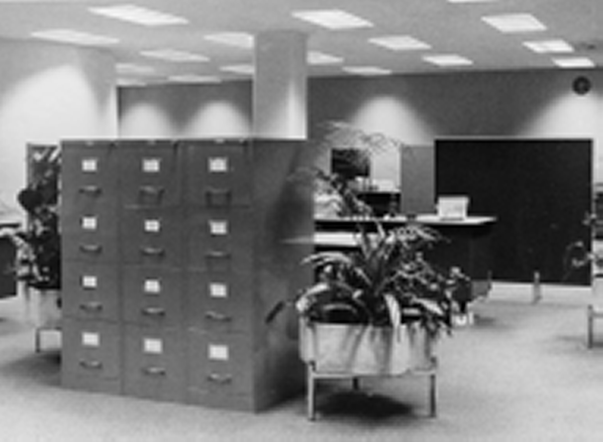 Del av kontorslandskapet - med en kontorsplats och mappskåp av plåt.