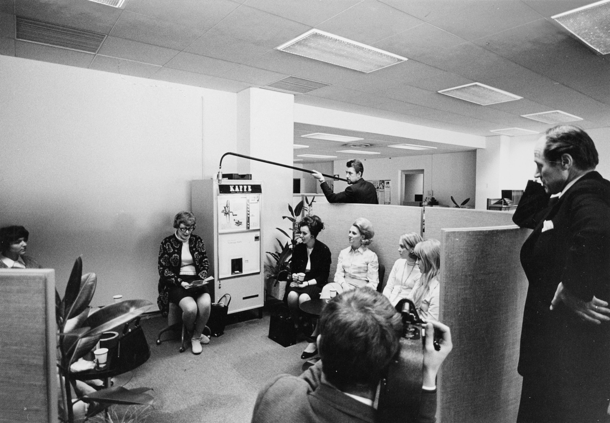 Sonja Åkesson läser medan den kaffedrickande personalen lyssnar uppmärksamt.