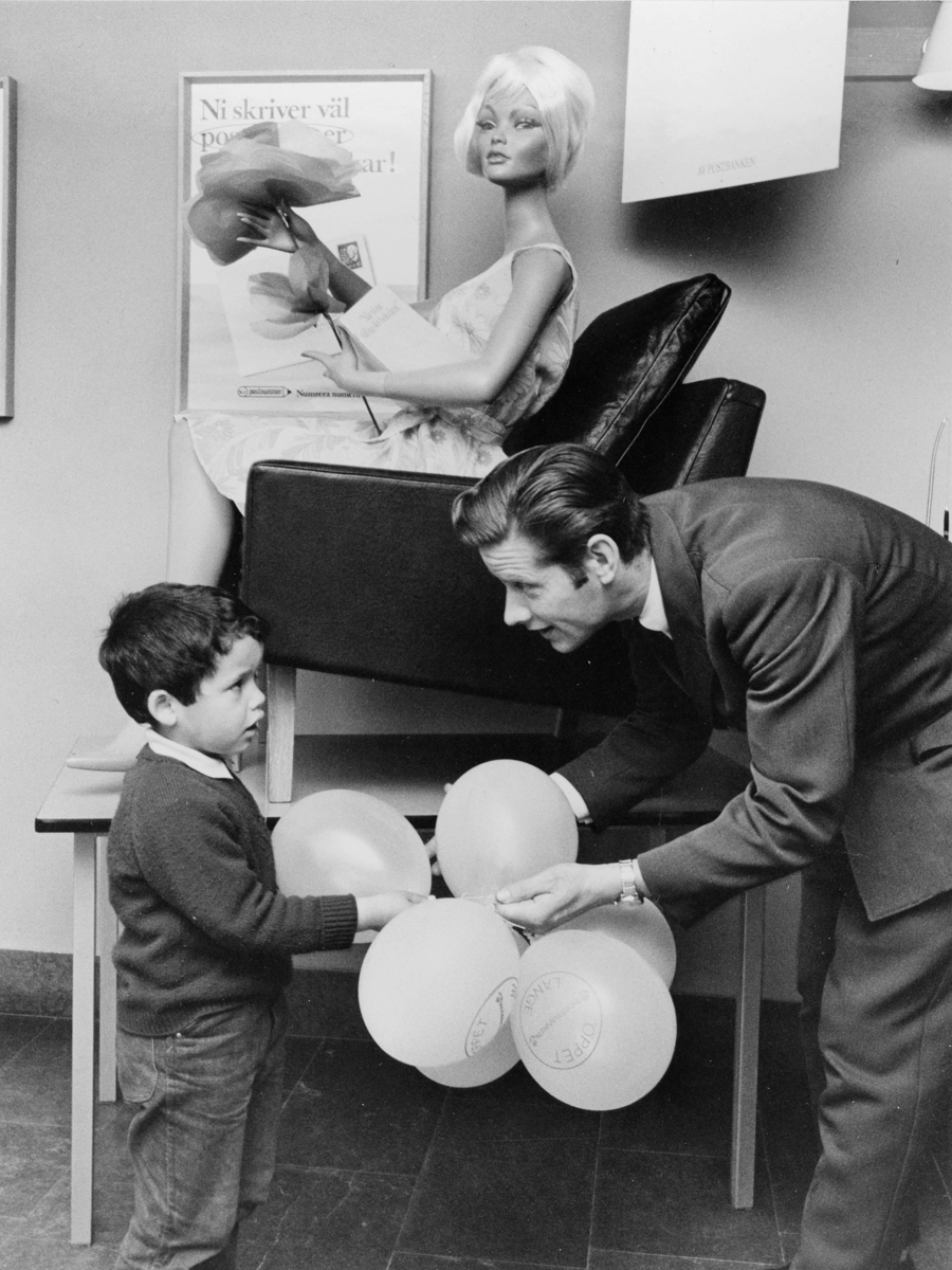 En av postkontorets postiljoner, fpj Sven Broberg, hjälpte till att dela ut ballonger till de barn som följde med när mamma hade postärenden.
