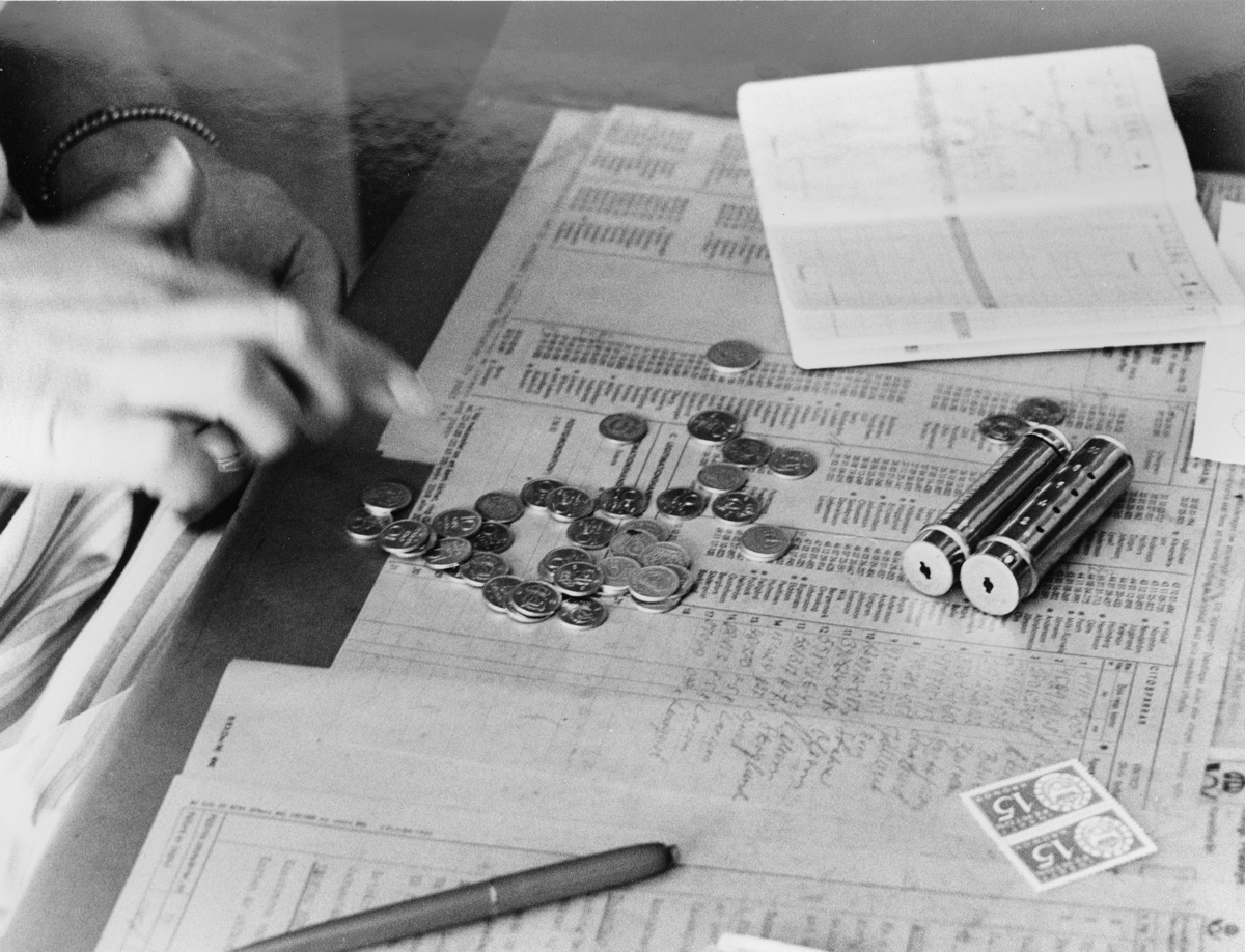 Postexpeditören räknar de 10-öringar som den ena av fickspar-bössorna har innehållit (den andra är fylld med 25-öringar).