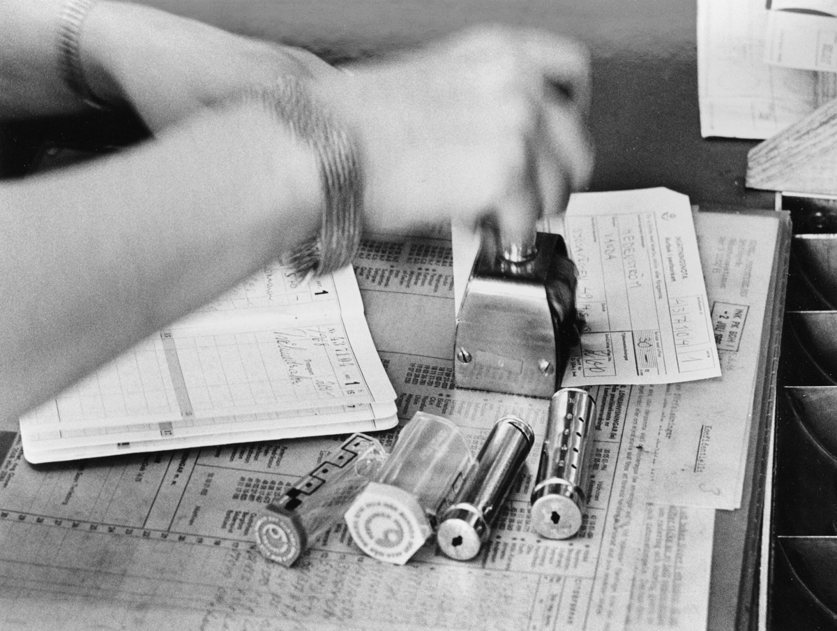 Postexpeditören har räknat innehållet i de båda ficksparbössorna av metall, vilka innehållit 10- och 25-öringar och för in beloppet i kundens postsparbanksbok. Vid återlämnandet får kunden två engångsficksparbössor avsedda för 25 st 1-kronor resp 40 st 25-öringar. OBS! Spärrlistorna.