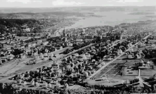 Stadsvy över Sundsvall. Stadsdelarna från förgrunden, Västermalm, Södermalm, Stenstaden, Norrmalm till höger i bakgrunden Sundsvallsfjärden. Troligen 1930 - tal. Text på vykortet "SUNDSVALL. Flygfoto.