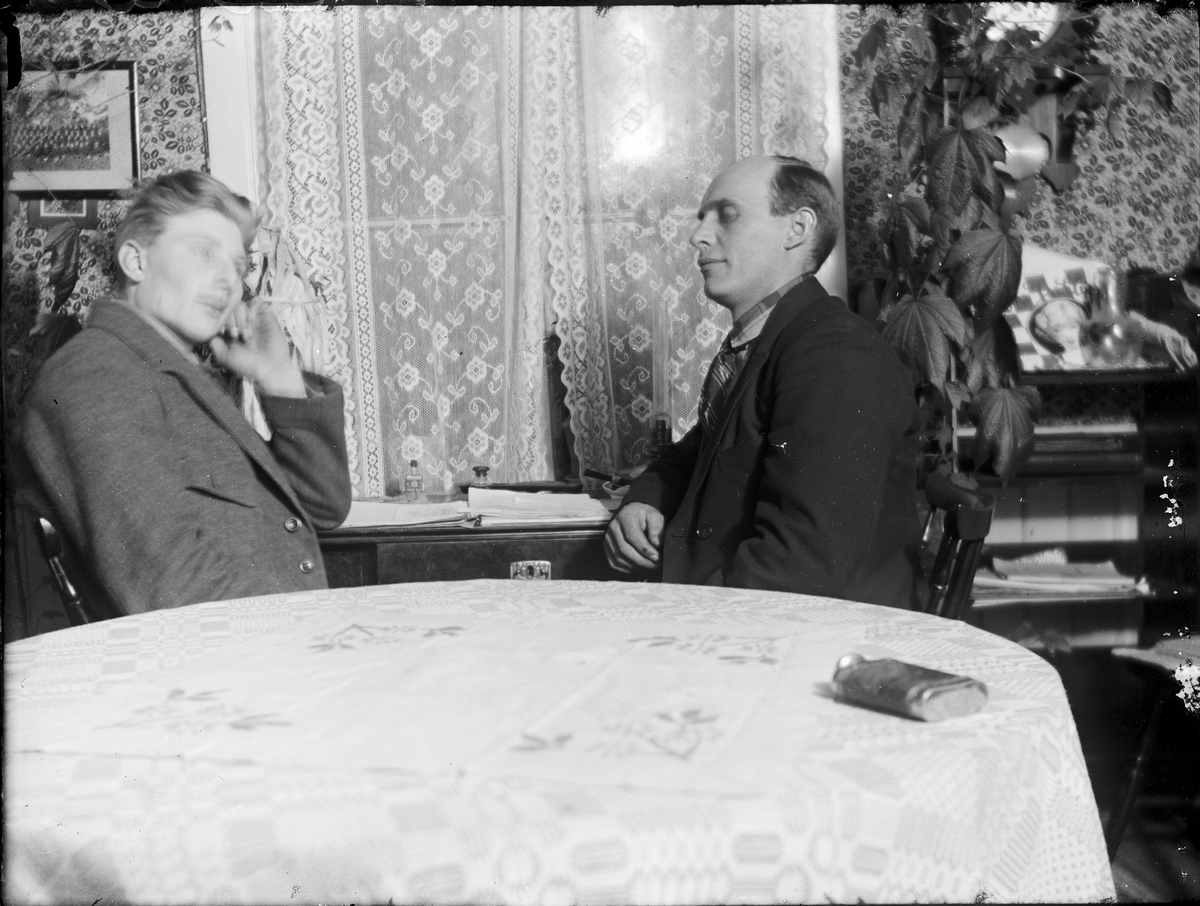 Två män vid ett bord i hemmiljö, Östhammar, Uppland