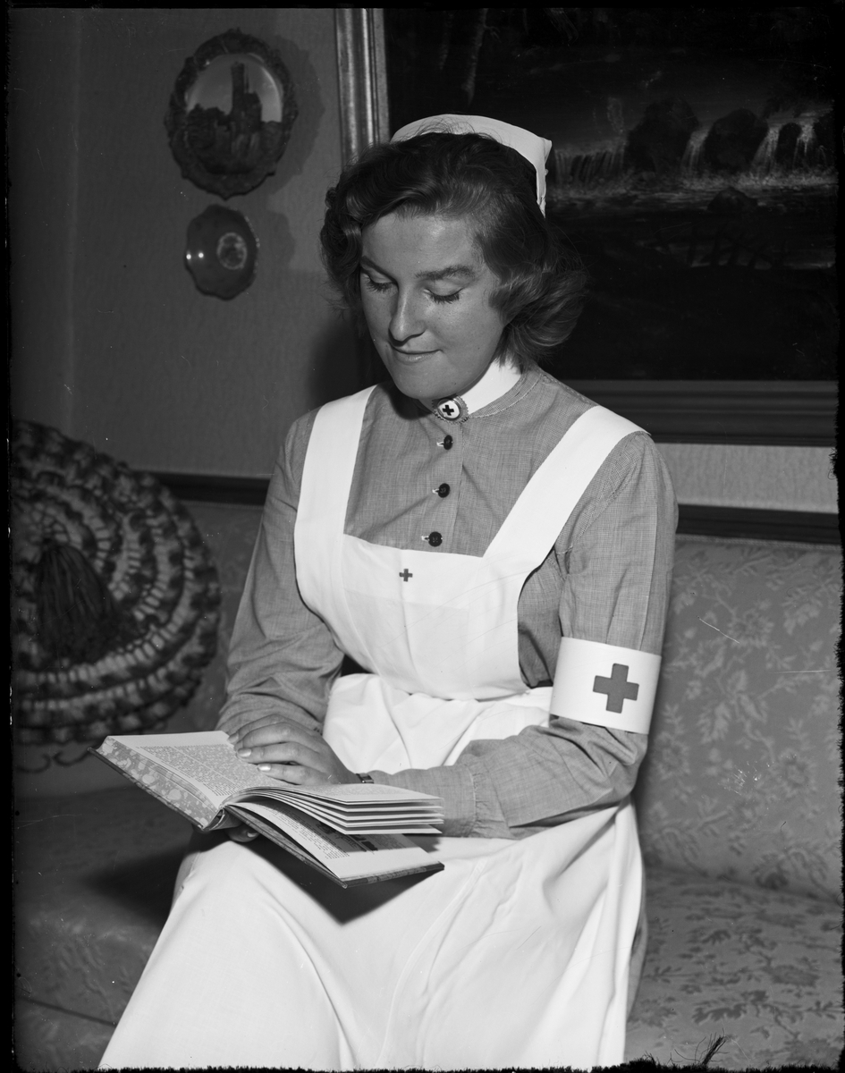 Kvinna i sjukvårdsuniform sitter i soffan och läser en bok, Östhammar, Uppland