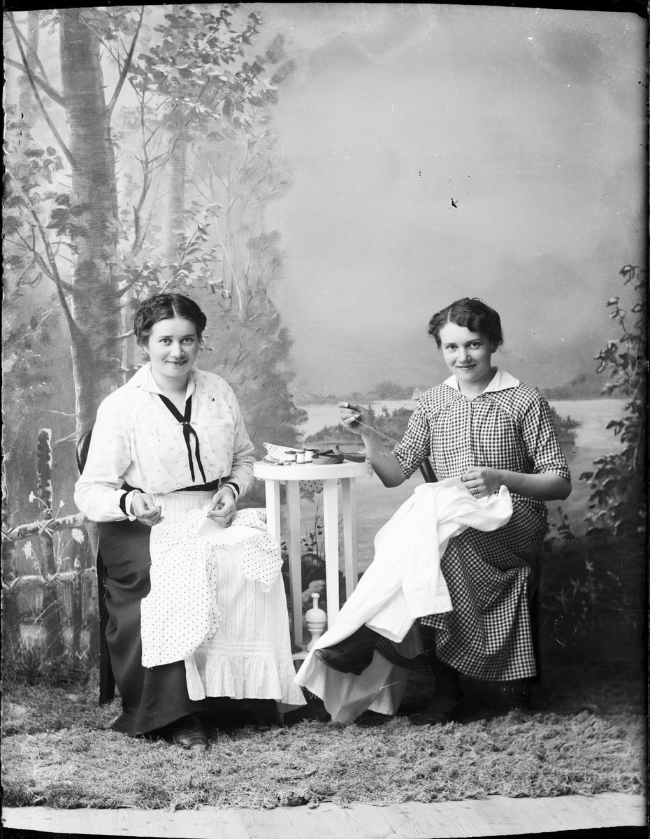 Ateljéporträtt - två kvinnor sitter och syr, Östhammar, Uppland