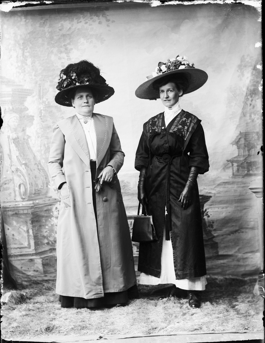 Ateljéporträtt - två kvinnor klädda i ytterkläder, Östhammar, Uppland