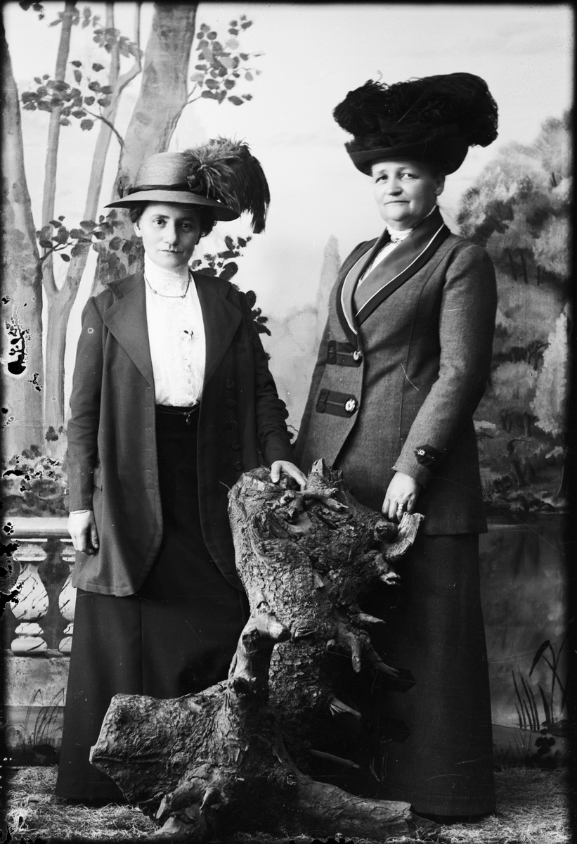 Ateljéporträtt - två kvinnor klädda i ytterkläder, Östhammar, Uppland