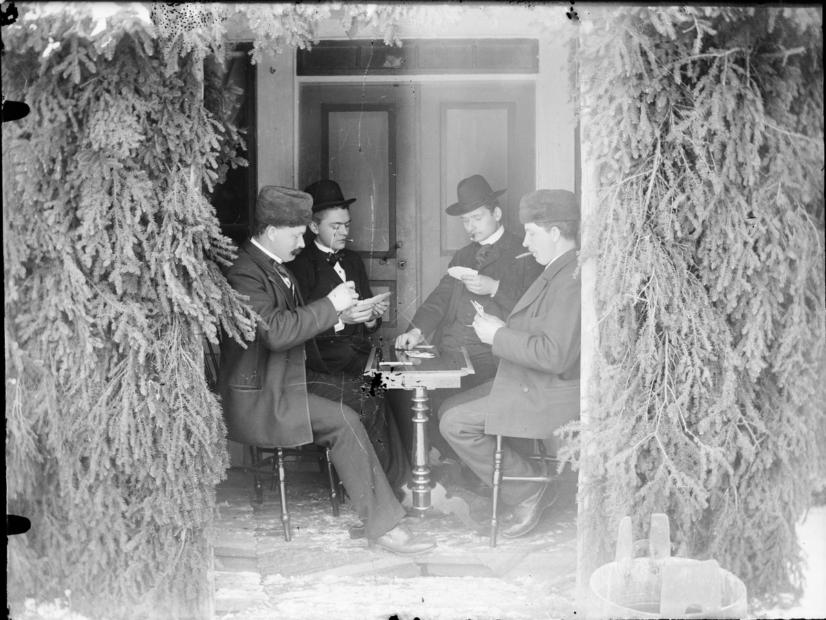 Fyra män spelar kort ute på verandan, Östhammar, Uppland