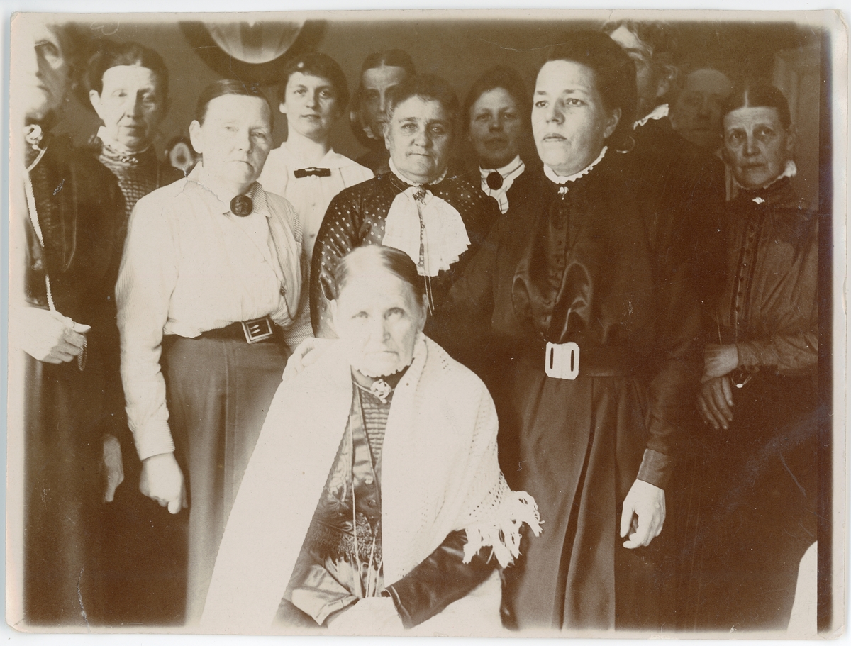 Brevkort - en äldre kvinna omgiven av kvinnor