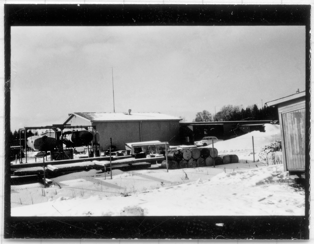 Vägstation B7, Åkersberga. Baksidan av förråds- och verkstadsbyggnaden. Luttunnor upphängda i ställningar. Upplag av bränslefat.