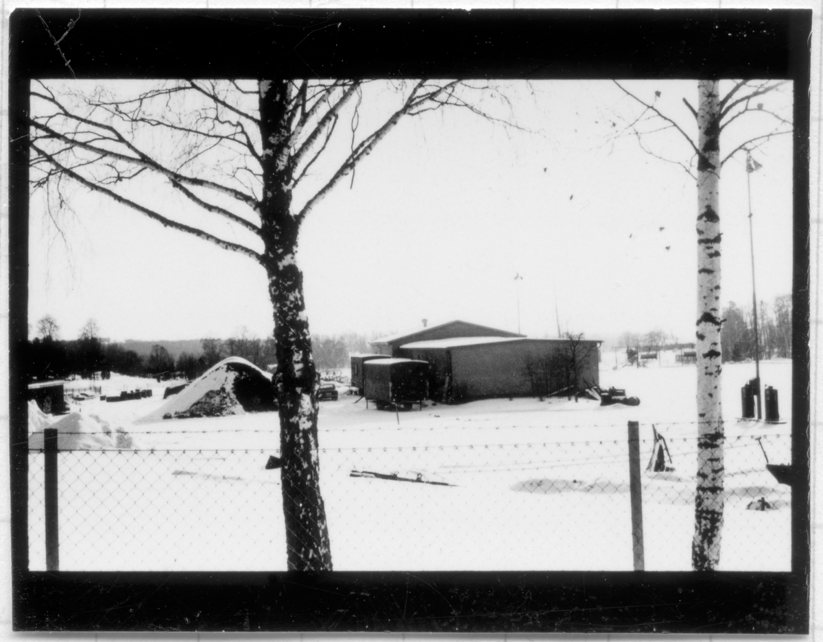 Vägstation B7, Åkersberga. Översiktsbild av förråds- och verkstadsbyggnaden. Bakom förrådet manskapsvagnar.