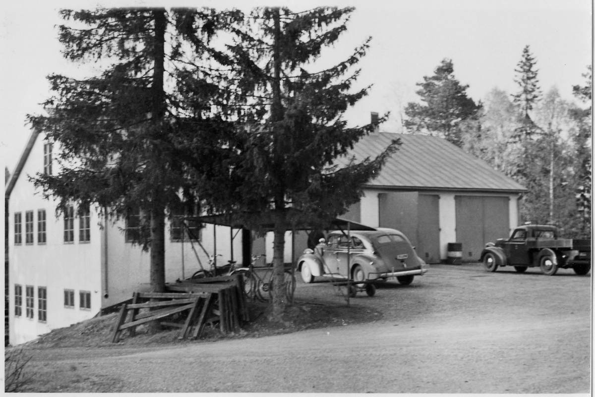 Vägstation Z9, Nälden. Vägstationens huvudbyggnad med kontor, förråd och garage i övre markplan och garage i souterrängvåningen. Personbilar på övre garageplan, cykelställ med cyklar.