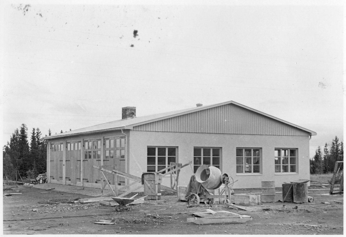Vägstation Z9, Nälden, filial Oviken. Garagebyggnad, under uppförande. Markberedning av garageplan pågår. Cement- och betongblandare, skottkärra.