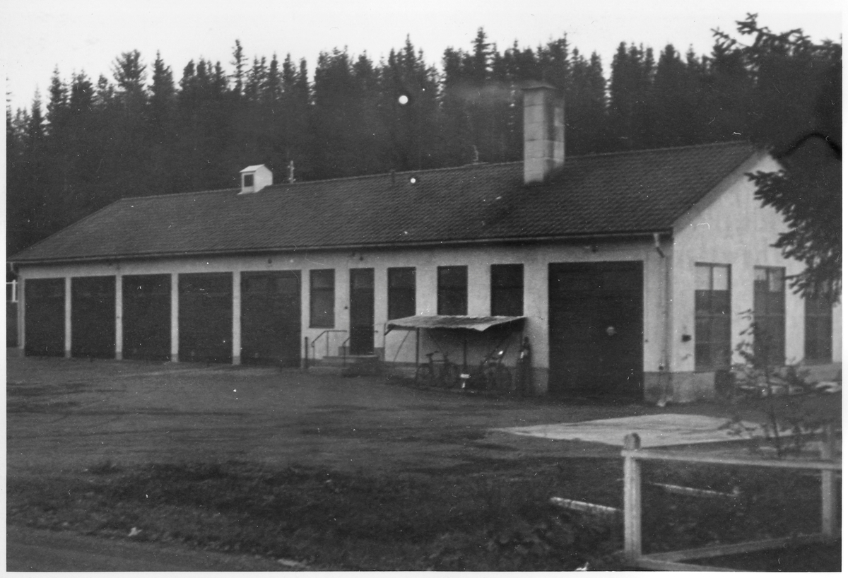 Vägstation Z12, Föllinge. Vägstationens huvudbyggnad med garage, kontor och verkstad. Cykelställ med cyklar framför kontoret.