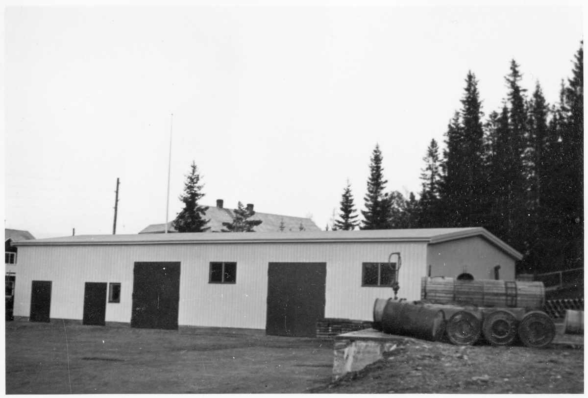 Vägstation Z12, Föllinge. Förrådsbyggnad. Till höger luttunna. Lastbrygga med bränslefat.