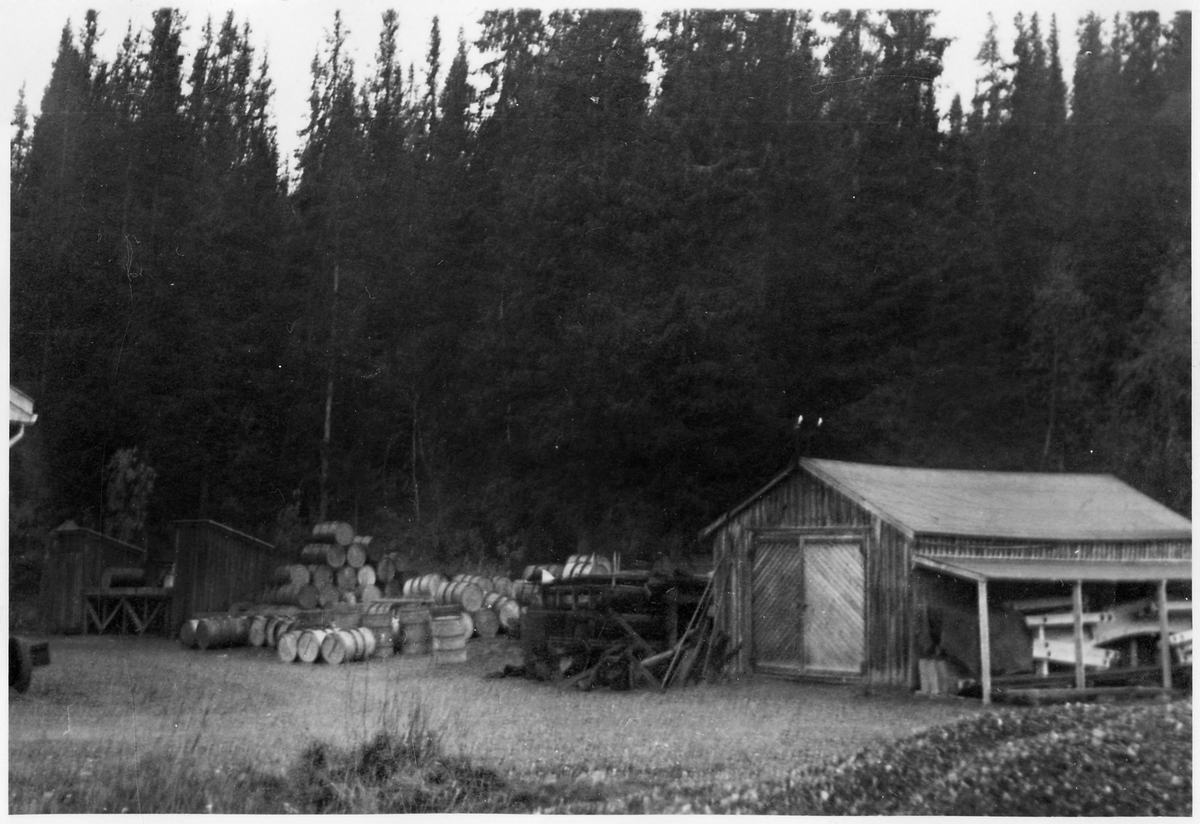 Vägstation Z13, Gäddede. Förrådsbyggnader. Upplag av bränslefat och diverse materiel.