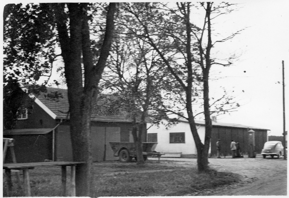 Vägstation R9, Lidköping, filial Vinninga. Garagebyggnader. Grusspridare framför byggnaden till vänster, personbil Volvo PV, bensinpump (drivmedelspump), två manspersoner vid bilen.