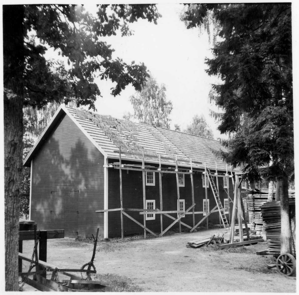 Vägstation G7, Ingelstad. Förrådsbyggnad i två våningar. Arbete pågår med nytt tegeltak, byggnadsställningar på framsidan. Vägsladd till vänster.