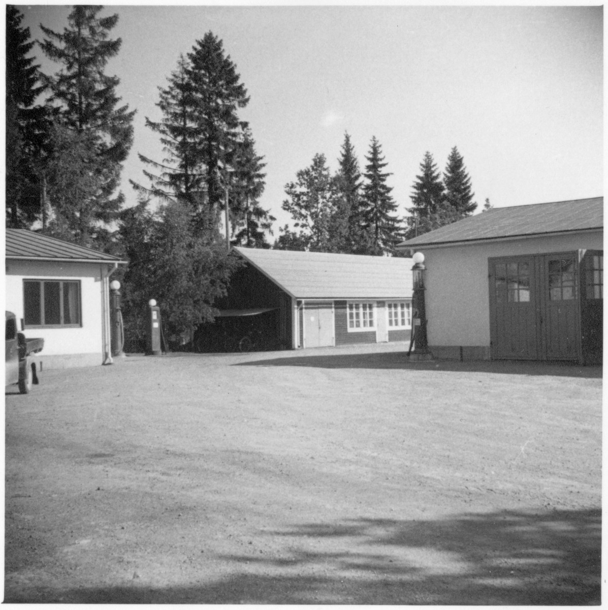 Vägstation G7, Ingelstad. Förrådsbyggnader och del av garagebyggnaden. Bensinpumpar (bränslepumpar). Del av liten lastbil, "paketbil" skymtar till vänster. Vid gaveln på en av förrådsbyggnaderna cykelställ med cyklar.