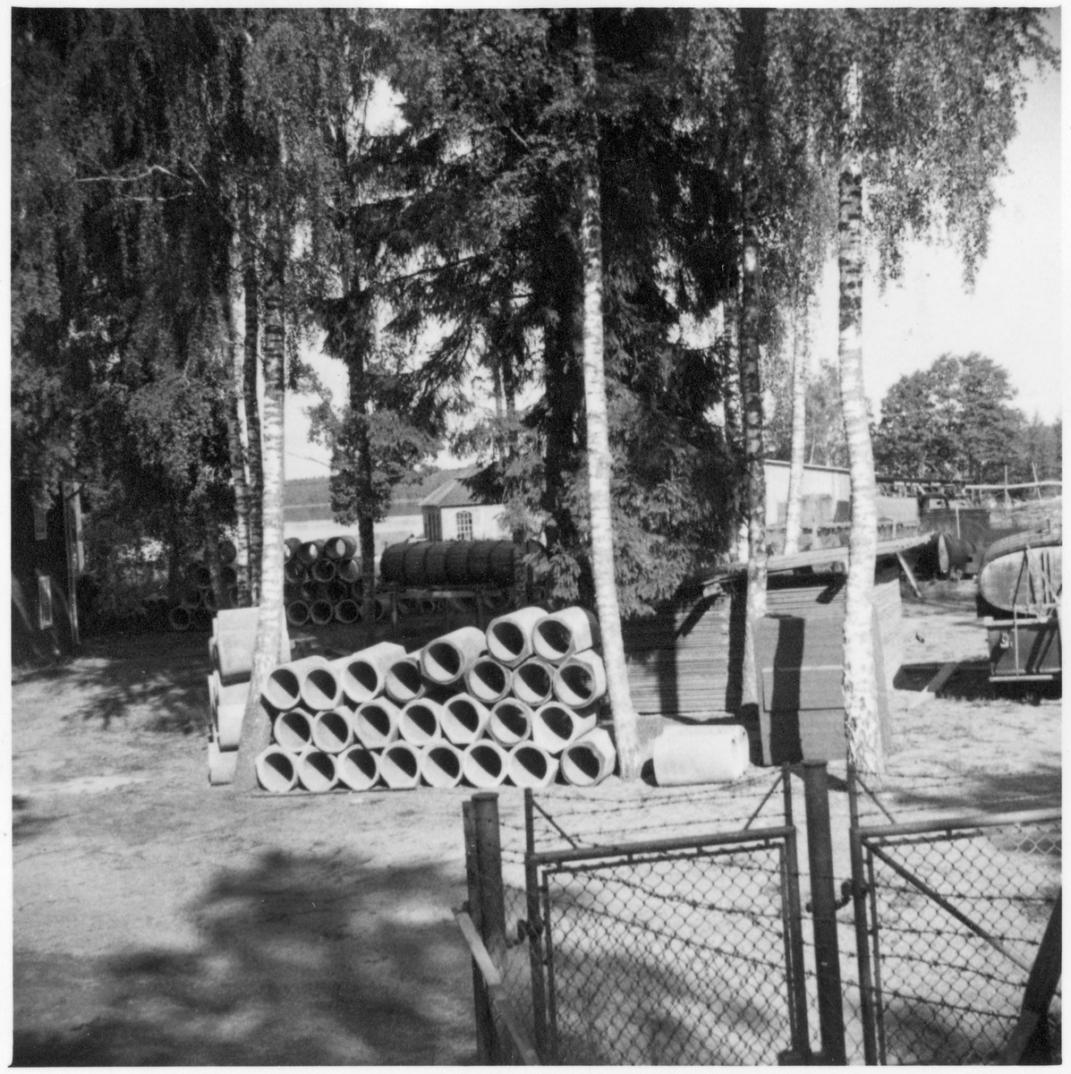 Vägstation G7, Ingelstad, filial Hovmantorp. Garagegården med diverse materielupplag. Lastbil med luttunna, cementrör.