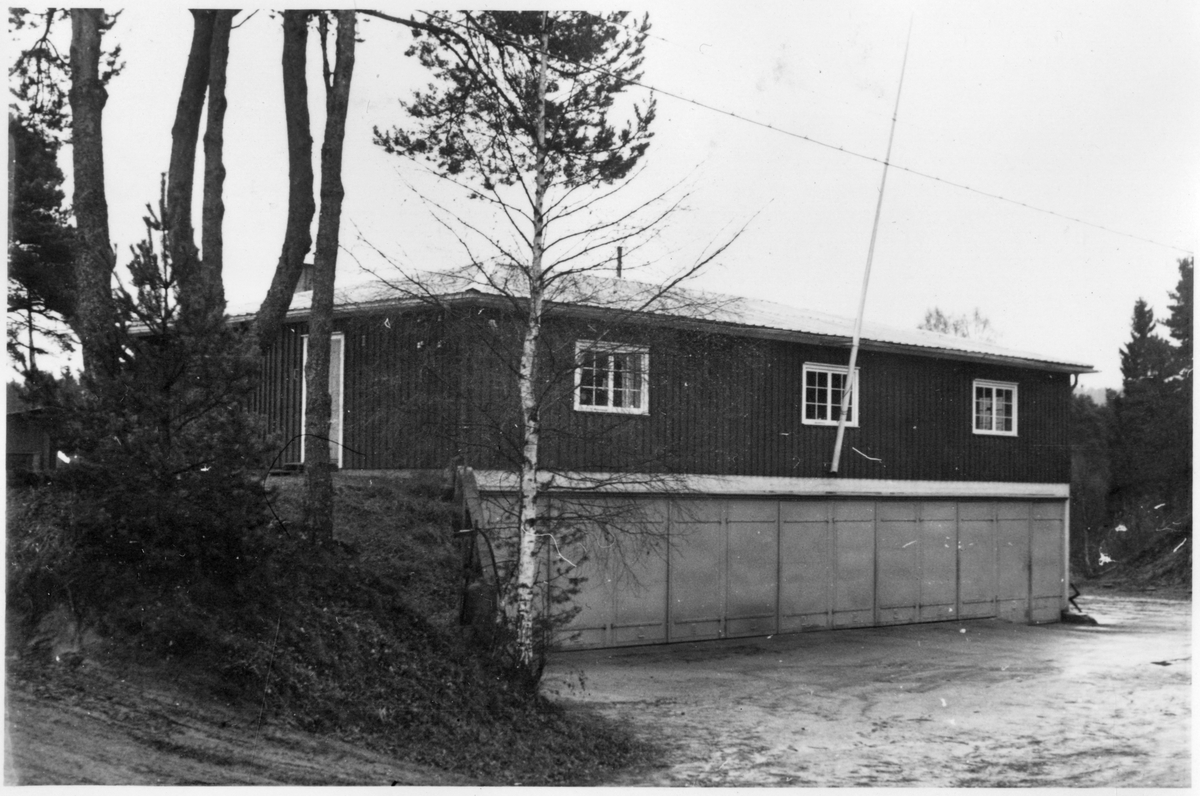Vägstation P5, Timmele. Vägstationens huvudbyggnad med garage i souterrängvåning. Kontorsdel och förråd i markplanet. Flaggstång fäst på långsidan av byggnaden.
