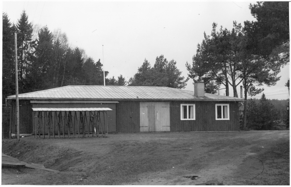 Vägstation P5, Timmele. Vägstationens huvudbyggnad med garage i souterrängvåning. Kontorsdel och förråd i markplanet. Framsidan med ingång till förråd och kontor. Mot väggen manskapsskåp för manskapets personliga utrustning och redskap. Cykelställ med cyklar.