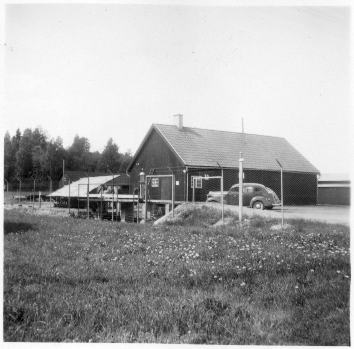 Vägstation T9, Storå. Garagebyggnad, kontor i byggnadens vänstra del. Bensinpump (drivmedelspump). Två personbilar framför garaget. Nätstängsel runt anläggningen