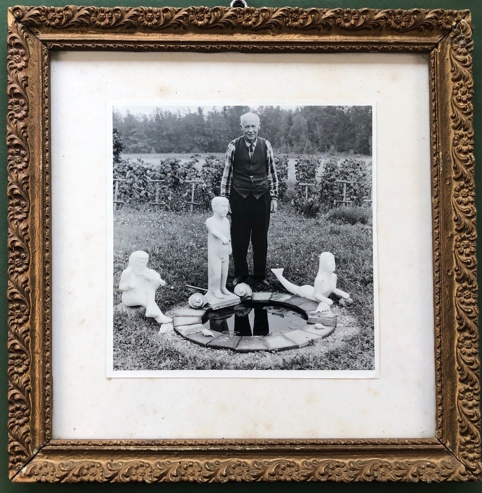 Vänersnäs, Åkerslund. Emil Karlsson vid sina konstverk